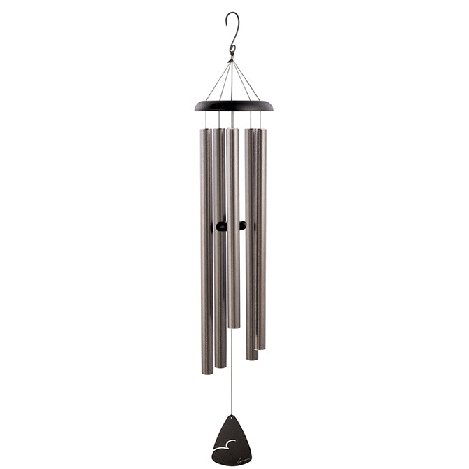 Chime has 5 heavy walled, center pinned tubes that emit a soothing and serene sound. Durable powder coated finish, all aluminum construction, and strung with industrial cord. Includes an adjustable striker.