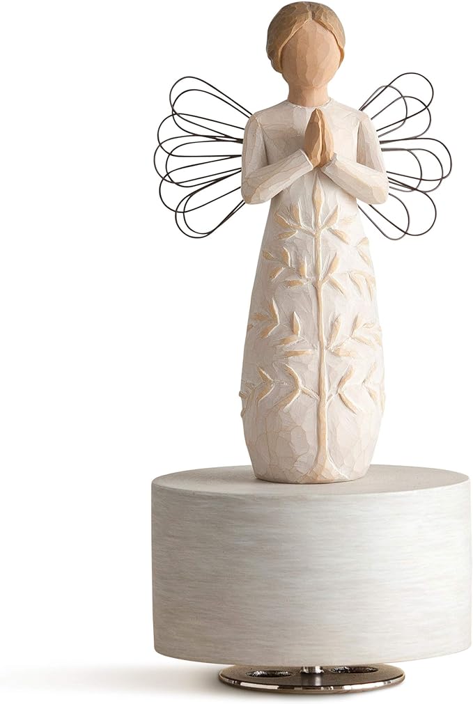 - Standing angel in cream dress with wire wings, with hands in prayer position; tree carving on angel's dress. Figure affixed to round, cream wood base containing musical element