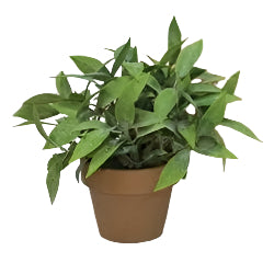 Gatehouse Herb Pot #3 is a faux potted plant with spear-like, pointed leaves in a brown, terra cotta style pot. Plant has detailed veining on the leaves for a realistic, true-to-life effect. Measures 6" high with a 3" diameter pot.