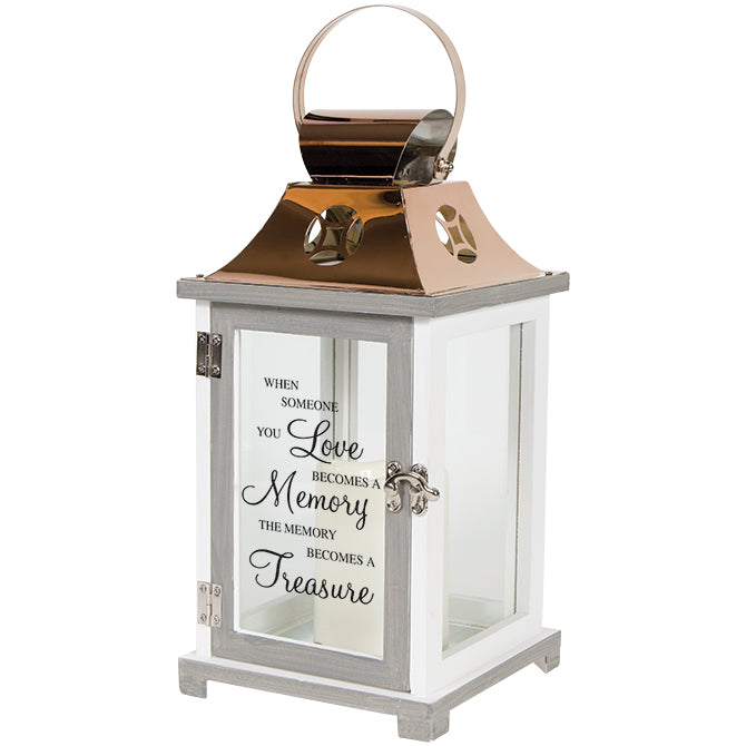 Our Light The Way Memorial Lanterns are made from quality composite wood and a stainless steel copper finish top. They feature a built-in automatic timer which runs for 6 hours on and 18 hours off(3-AAA batteries are NOT included) and are inscribed with sentimental quotes. DO NOT use fire burning candles in the lanterns. Suitable for hanging or free-standing use inside. Recommended as an accent in floral arrangements for many occassions!