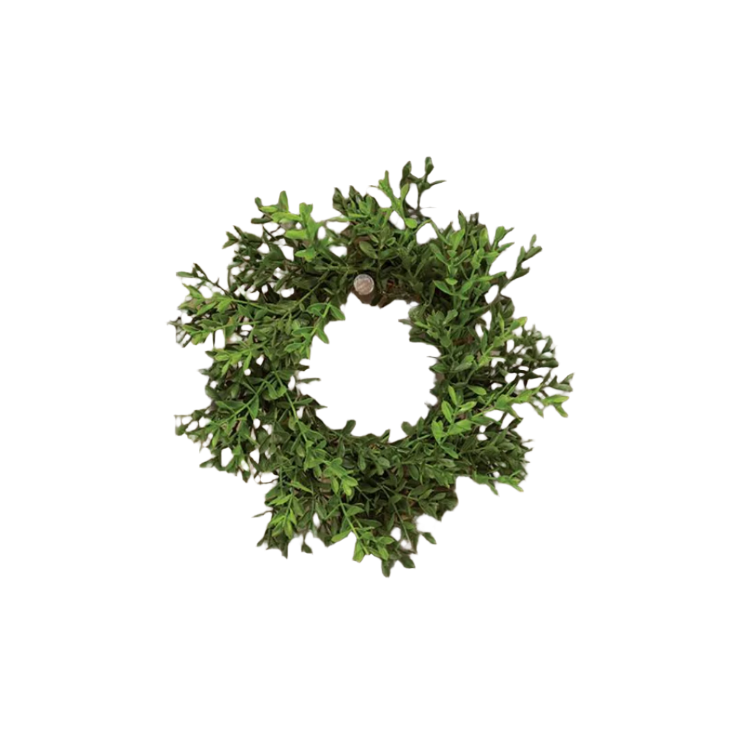 New England Boxwood Ring is an everyday floral that is suitable for any decor. Greenery is assembled on a twig wreath base. Measures approximately 4" inside diameter and 7" outside diameter.