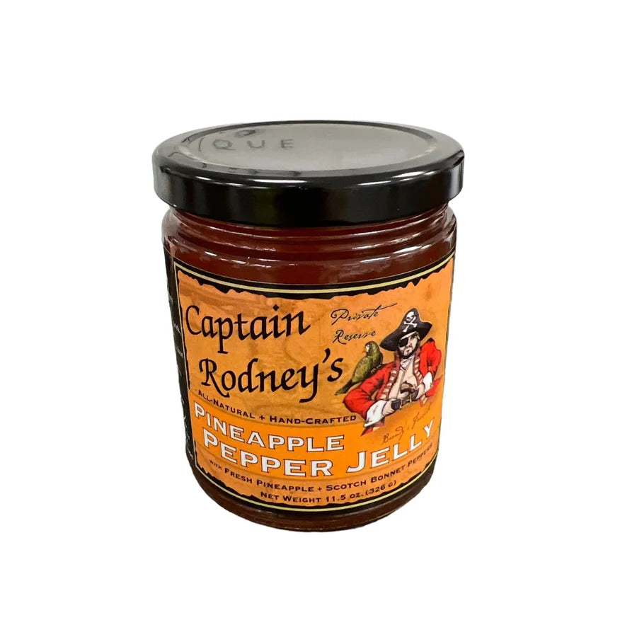 Captain Rodney’s Private Reserve Pineapple Pepper Jelly brings a tropical taste to the multi-award winning Scotch Bonnet Pepper Jelly recipe. This new sensation adds fresh pineapple to the unique flavor of the Jamaican Scotch Bonnet pepper, combined with locally grown sweet bell peppers, apple cider vinegar and pure cane sugar, for an exciting new take on an old favorite. All-natural, cooked in open pots in small batches with only the finest ingredients for a truly homemade taste. The pineapple pepper jelly is perhaps best when served as an appetizer with cream cheese and crackers, but is also excellent as a marinade for fowl, pork, beef or game.