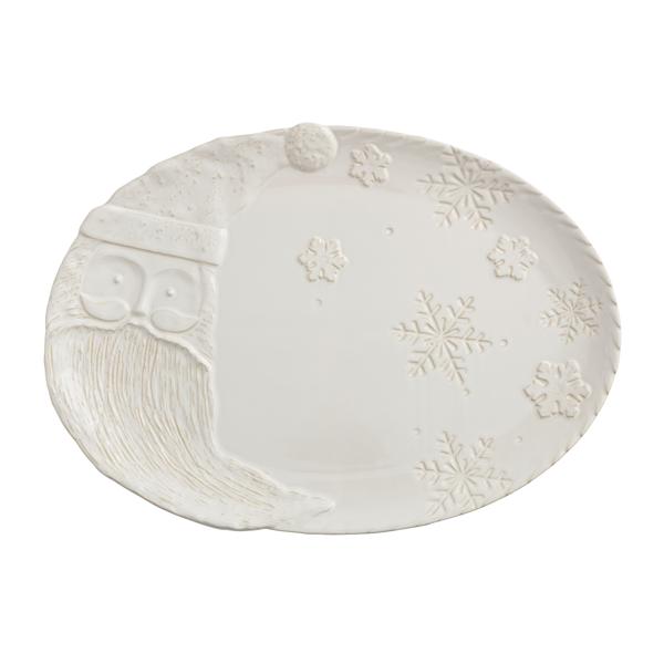Celebrate the holiday season with this charming White Christmas Santa Platter, perfect for adding a festive touch to your dining table. Crafted from durable stoneware, this platter features a milk-glazed finish that enhances its elegant appearance. The intricate textured relief design showcases a jolly Santa face surrounded by delicate snowflakes, creating a whimsical and inviting atmosphere for your holiday gatherings. Measuring 12" x 16 1/2", this generously sized platter is ideal for serving a variety of holiday treats, from cookies and pastries to appetizers and main courses. Its sturdy construction ensures it can handle the demands of any festive feast, while its timeless design makes it a delightful addition to your holiday decor. Whether you're hosting a Christmas dinner or simply enjoying a cozy family meal, this Santa platter is sure to bring joy and cheer to your celebrations.