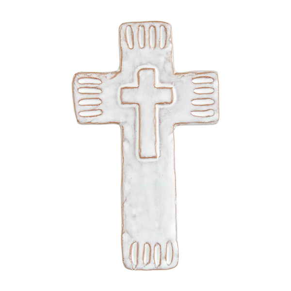 Meticulously fashioned from premium stoneware, this cross boasts an enchanting milk glazed finish that adds a touch of sophistication to any space. Embrace the beauty of its carefully curated coloring and intricate details that gracefully adorn its surface. Versatile and timeless, this cross serves as the ideal neutral accent, effortlessly complementing every season's decor. Share the gift of love with friends and family by presenting them with this charming cross. Measuring at 5 1/2" x 3 1/4", it is the perfect size to grace any cherished spot in your home.