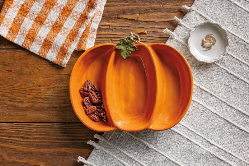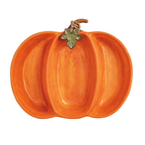 Elevate your autumn gatherings with our Pumpkin Triple Dip Platter, a charming addition to any table setting. Crafted from durable stoneware, this platter features a delightful pumpkin design complemented by intricate figural leaf details, adding a touch of seasonal elegance. Measuring 8" x 11", it's the perfect size for serving a trio of your favorite dips, sauces, or condiments. Whether you're hosting a festive dinner or enjoying a cozy night in, this versatile server is sure to impress your guests and enhance your culinary presentation. Ideal for both casual and formal occasions, it seamlessly blends functionality with style, making it a must-have for your fall entertaining needs.