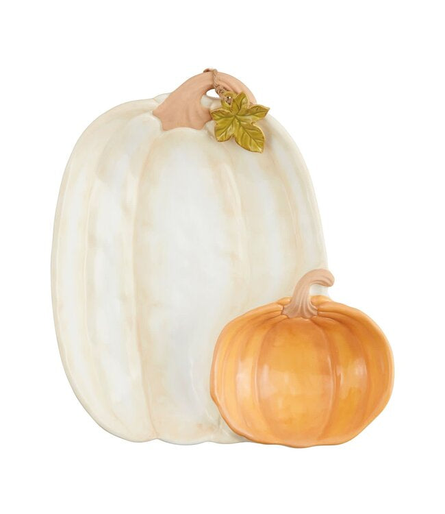 Hand-painted stoneware pumpkin chip bowl features attached pumpkin dip cup.