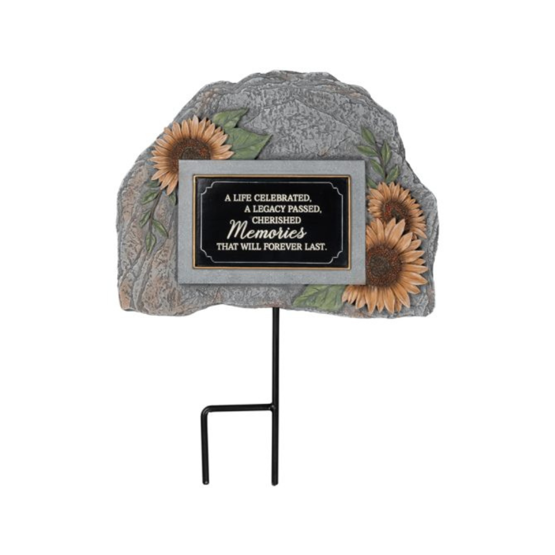 These memorial stones are made of hand-painted resin. They feature a detachable powder coated metal stake that is h-based for sturdiness. The stone reads, "A life celebrated, a legacy passed, cherished memories that will forever last." The stone measures 8"H x 10"W and the stake measures 6"H