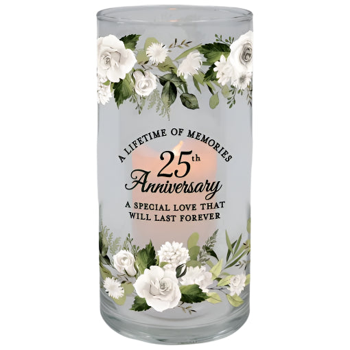 These hurricane candles are made of glass with UV printed artwork. The included candle has a flameless LED flickering flame that runs on an automatic timer 6hrs ON and 18hrs OFF. The required CR2032 battery IS included.