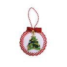 Christmas Tree Embroidered Ornament. This plush cotton ornament is a delightful addition to your holiday decor, featuring a luxurious velvet bow that adds a touch of elegance. The ornament is adorned with a charming jingle bell, creating a festive sound that enhances the holiday spirit. Its layered felt disc showcases an intricately embellished Christmas icon, adding a unique and artistic flair. Measuring 4 inches in diameter, this ornament is crafted from 100% cotton, ensuring a soft and durable quality. Perfect for hanging on your Christmas tree, wreath, or garland, it brings a cozy and joyful atmosphere to your home. Ideal for gifting or personal use, this ornament is a timeless piece that captures the essence of the holiday season.