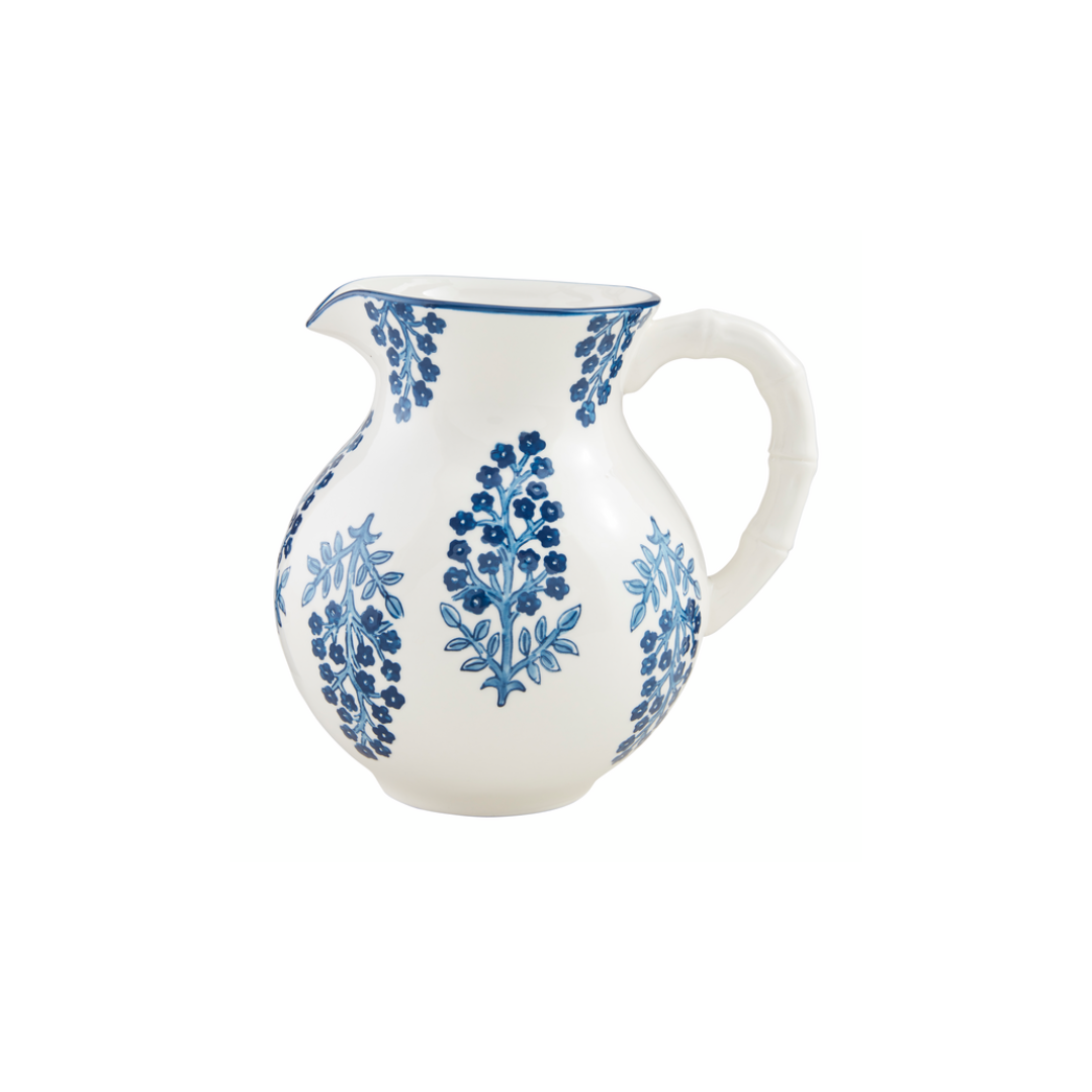 Blue Block Print Pitcher. This exquisite hand-stamped stoneware pitcher features a captivating blue block print design, adding a touch of elegance to any table setting. The hand-painted rim enhances its artisanal charm, showcasing the craftsmanship involved in its creation. With a generous capacity of 72 oz, it is perfect for serving your favorite beverages, whether it's refreshing iced tea, fresh lemonade, or chilled water. Made from durable stoneware, this pitcher is not only a functional piece but also a beautiful decorative item that complements both modern and traditional decor styles. Ideal for entertaining guests or for everyday use, it brings a unique and artistic flair to your dining experience.