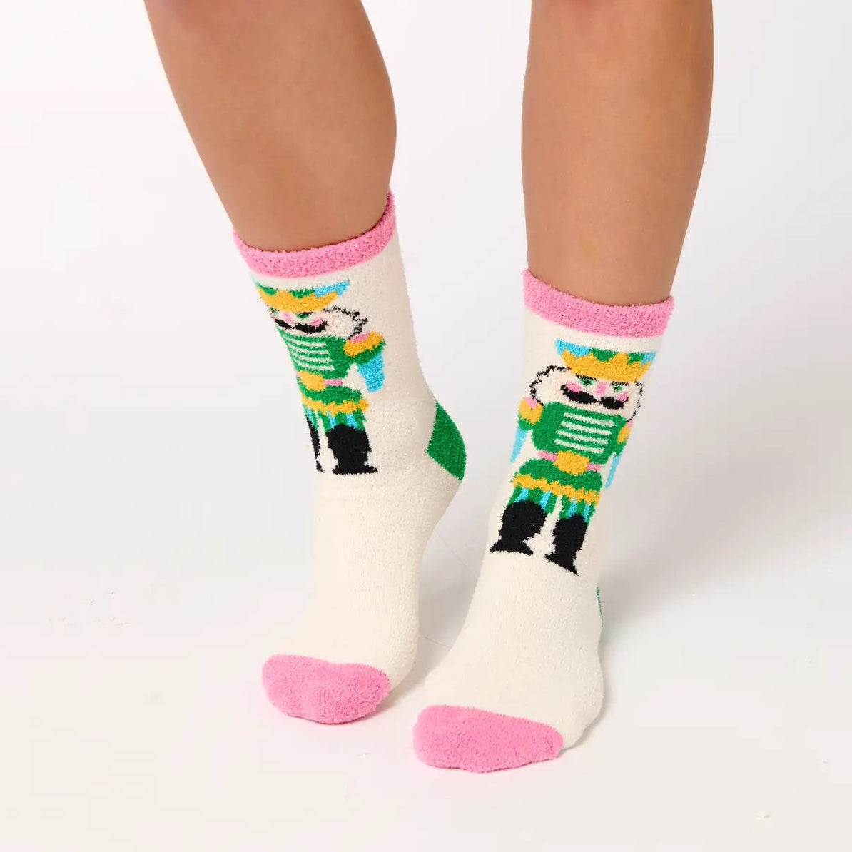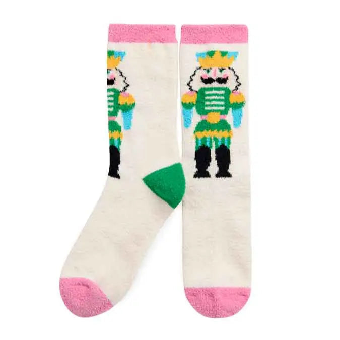 March into cozy holiday vibes with our Nutcracker Socks! Featuring a festive nutcracker design in cheery shades of green, pink, yellow, and blue, these socks bring storybook magic straight to your toes. With soft fuzzy fabric and a comfy fit, they’re perfect for lounging by the tree or twirling through your own winter wonderland. Finished with sweet pink accents at the cuff and toe, they’re a playful twist on a classic holiday icon.