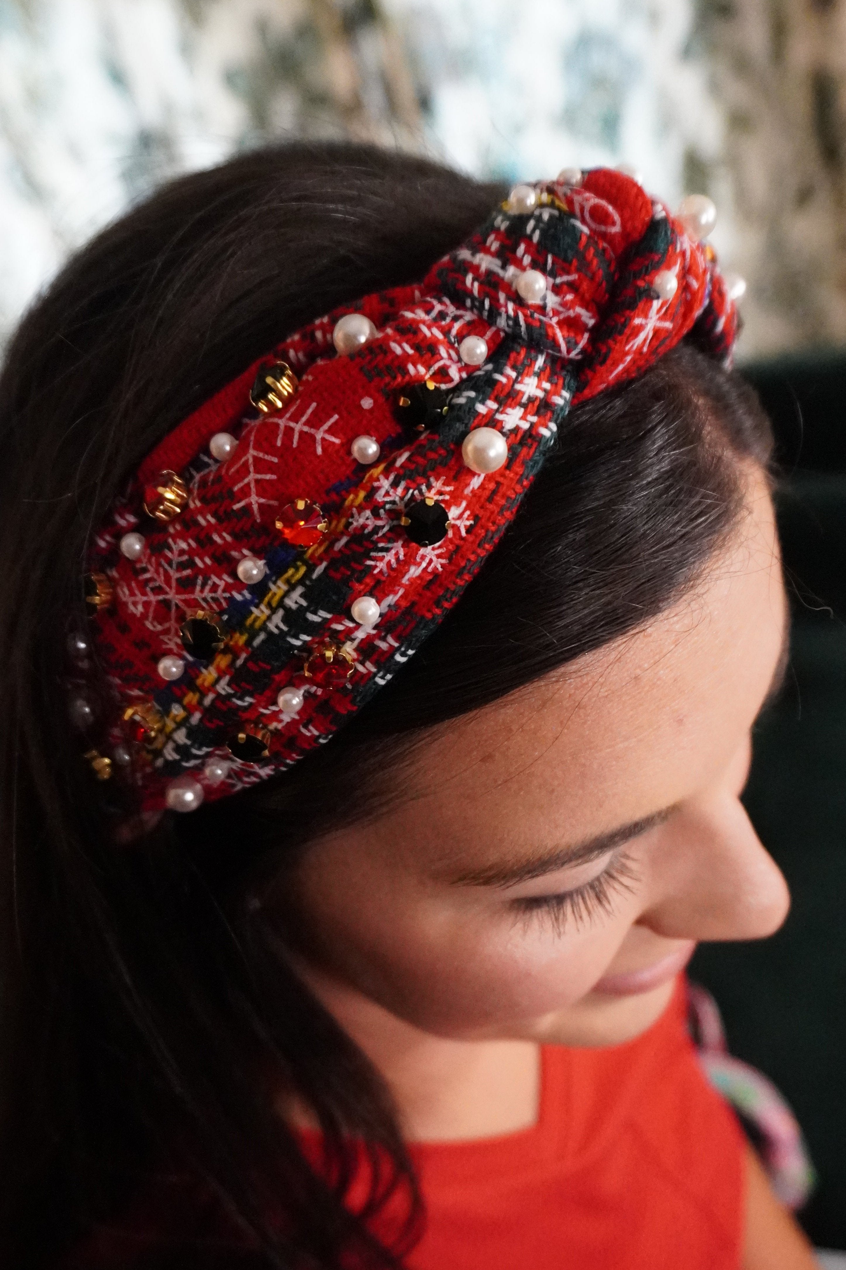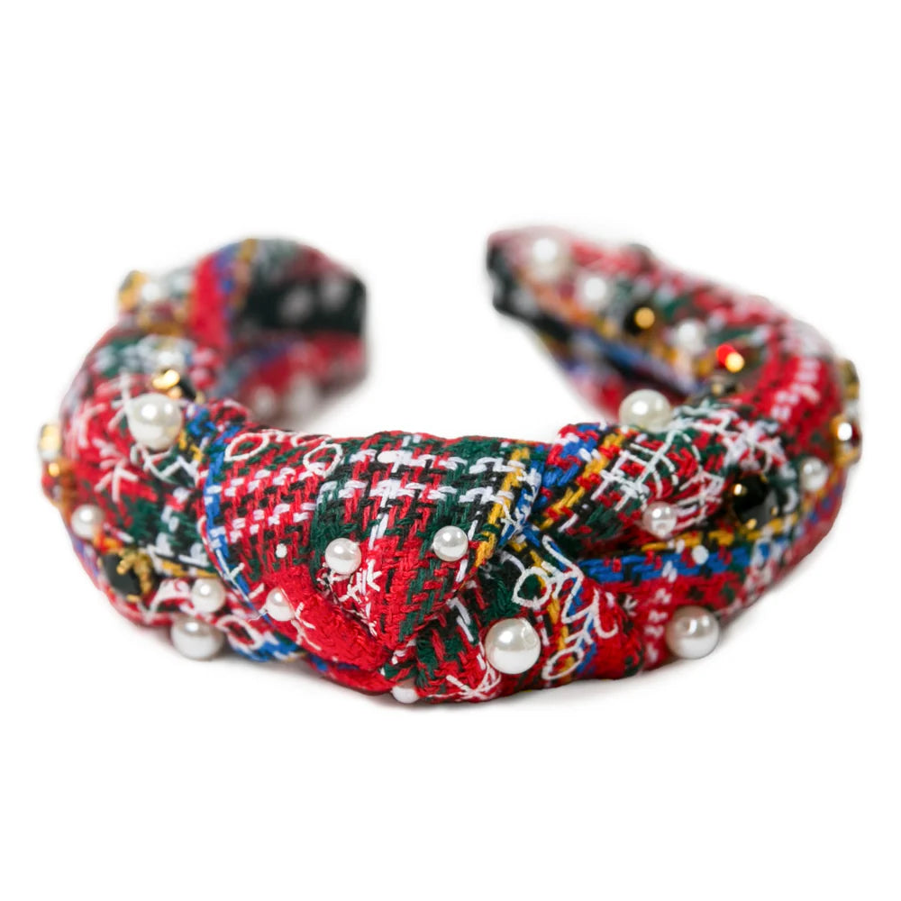 Red plaid pearl beaded headband with top knot.  Great for the holidays or every day.  One size. Perfect as gifts!
