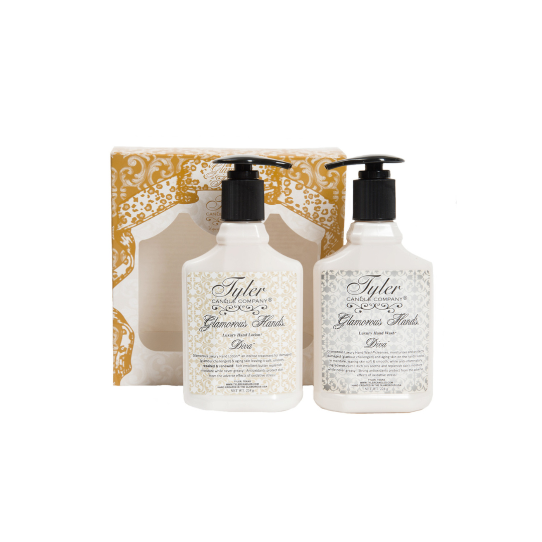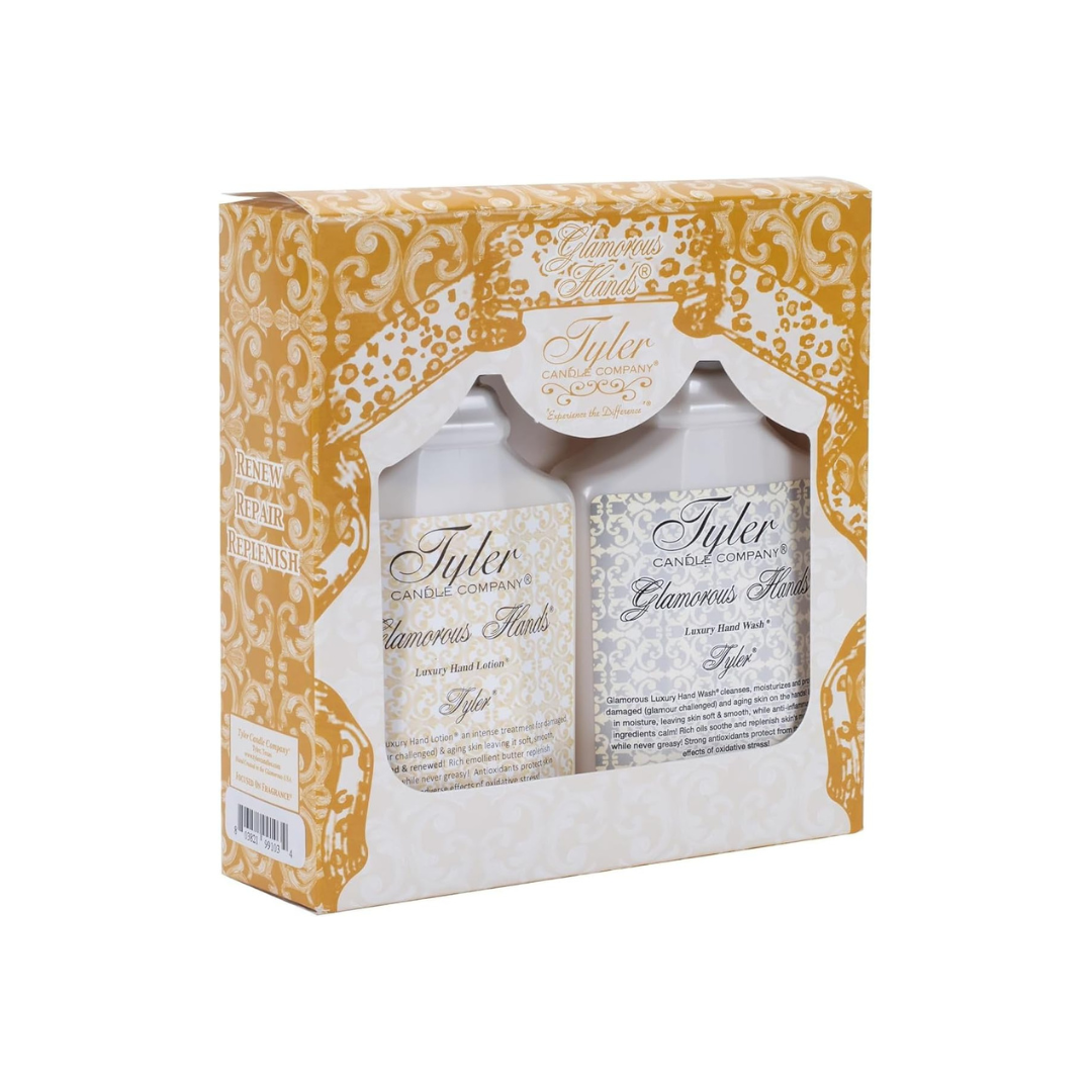 Tyler Candle Company's luxury hand lotion & hand soap gift set is just what you need to moisturize and condition your dry hands. The gift set is perfect for gift giving packaged in a decorative baroque gift box.