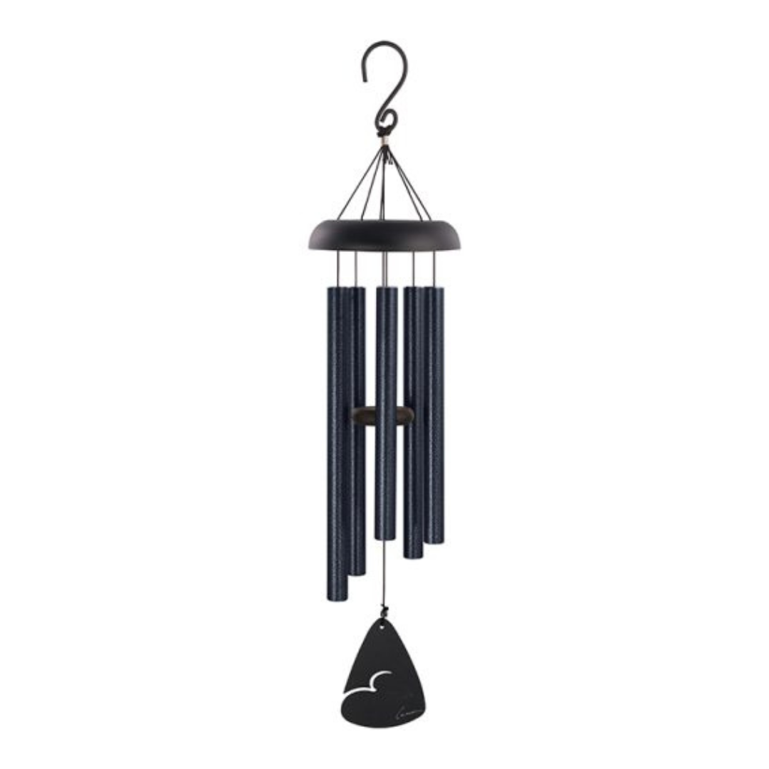 Chime has 5 heavy walled, center pinned tubes that emit a soothing and serene sound. Durable powder coated finish, all aluminum construction, and strung with industrial cord. Includes an adjustable striker.