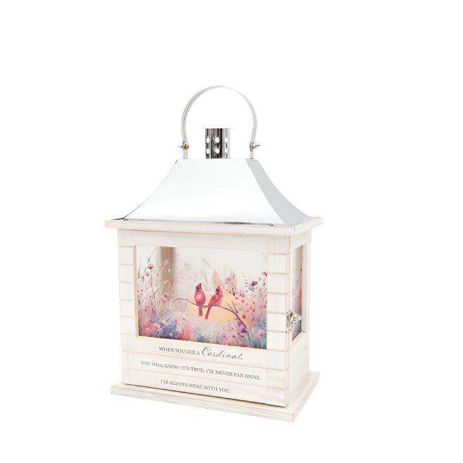 Lantern Reads: “When you see a cardinal, you will know it’s true, I’m never far away, I’m always here with you.”