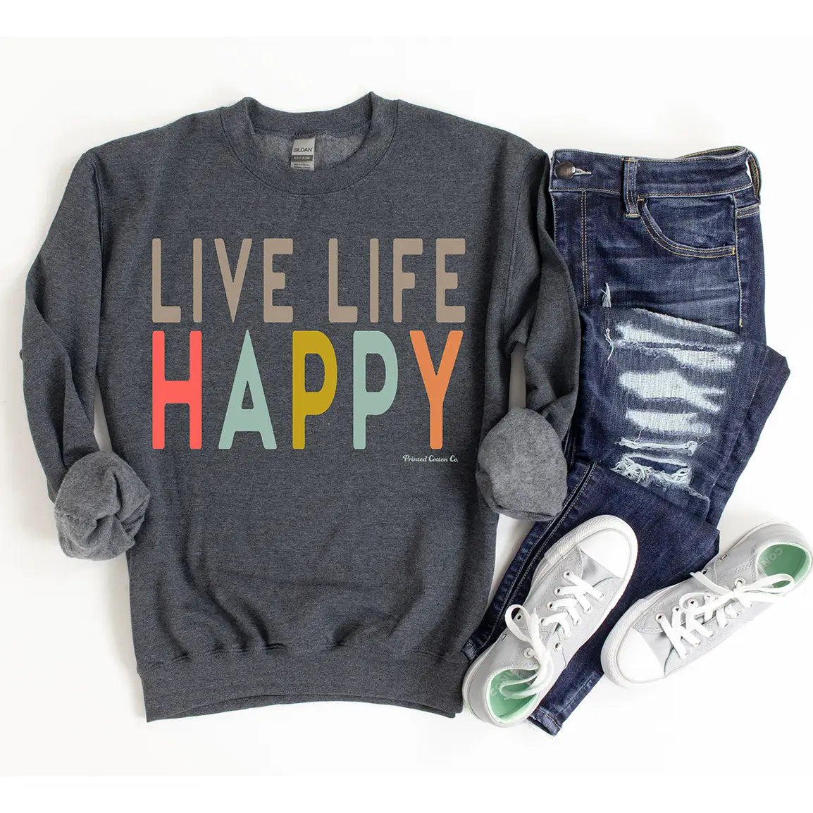 Experience pure joy and comfort with our Live Life Happy Crew Neck sweatshirt! Part of our "Be Happy" collection, the bright letters will remind you to always stay positive. Stay comfortable all day long with this cozy and inspiring addition to your wardrobe.