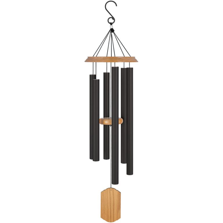 Made of all wood and aluminum construction. The durable powder coated finish along with the industrial cord makes for a chime that will withstand the elements. Each of the tubes are tuned to a note in a specific key – this chime is tuned to the scale of A. This chime also features our adjustable striker! 7/8" diameter tubes